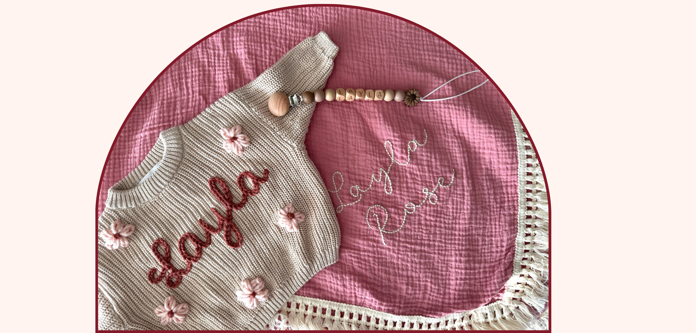 Bean & Blossom was born from the love between a mama and her little girl—the sweet inspiration behind our name and the heart of everything we do. Named after my daughter (lovingly nicknamed Bean) this shop began as a creative outlet during maternity leave, and quickly bloomed into something more. Each piece is hand-crafted with care, designed to celebrate the magic and beauty of the names you so lovingly chose.